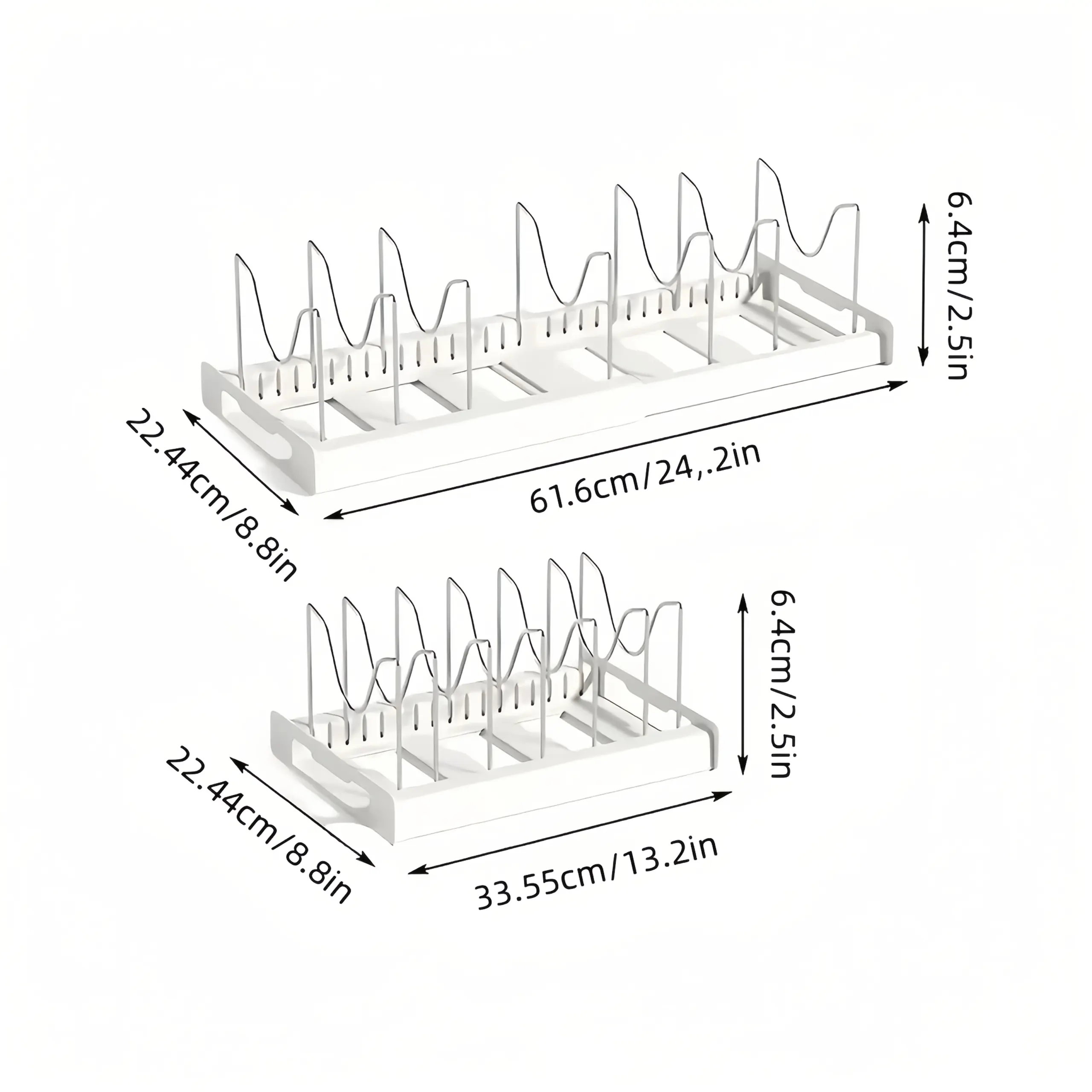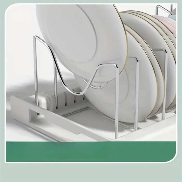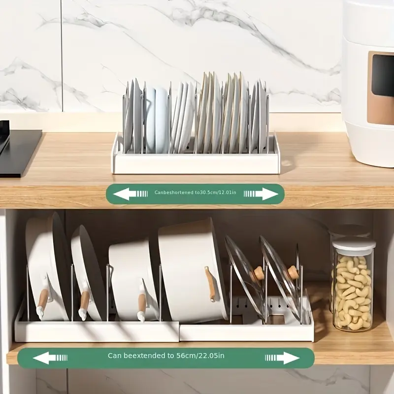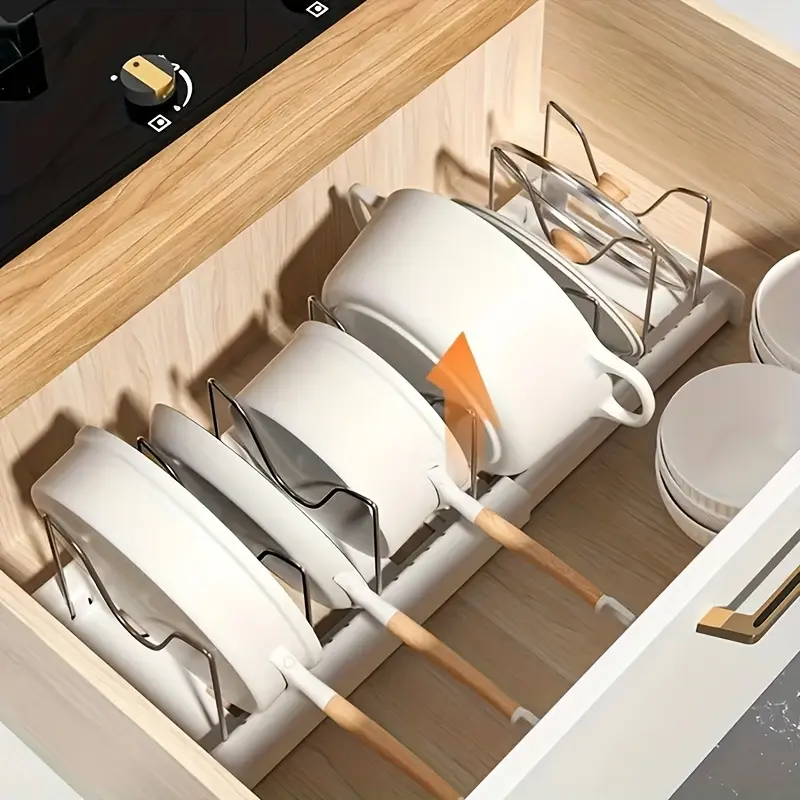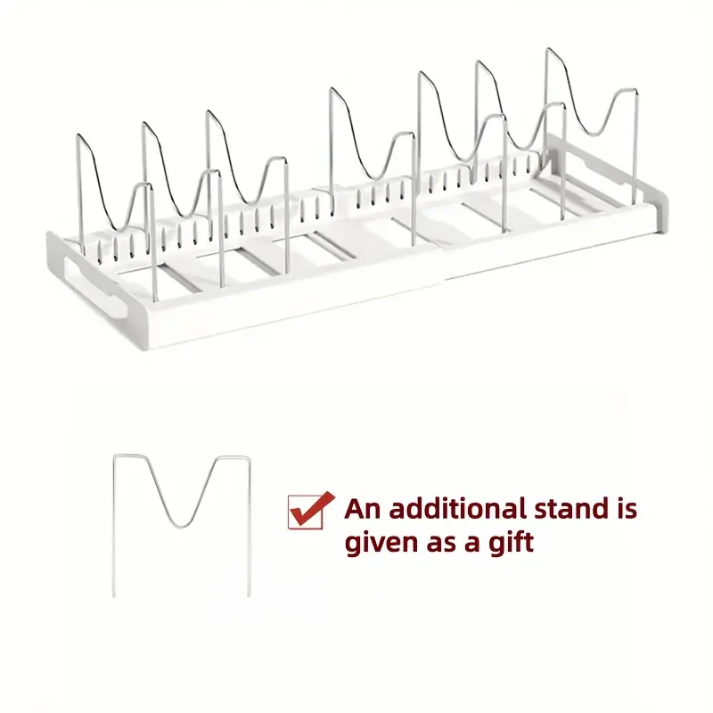 This adjustable organizer rack is designed to keep cookware and flat kitchen items separated and easy to access. The expandable frame helps adapt the layout to different storage widths. Removable dividers create individual slots to reduce shifting and contact between items. The open rack structure supports quick visual identification and simple repositioning when needed.
