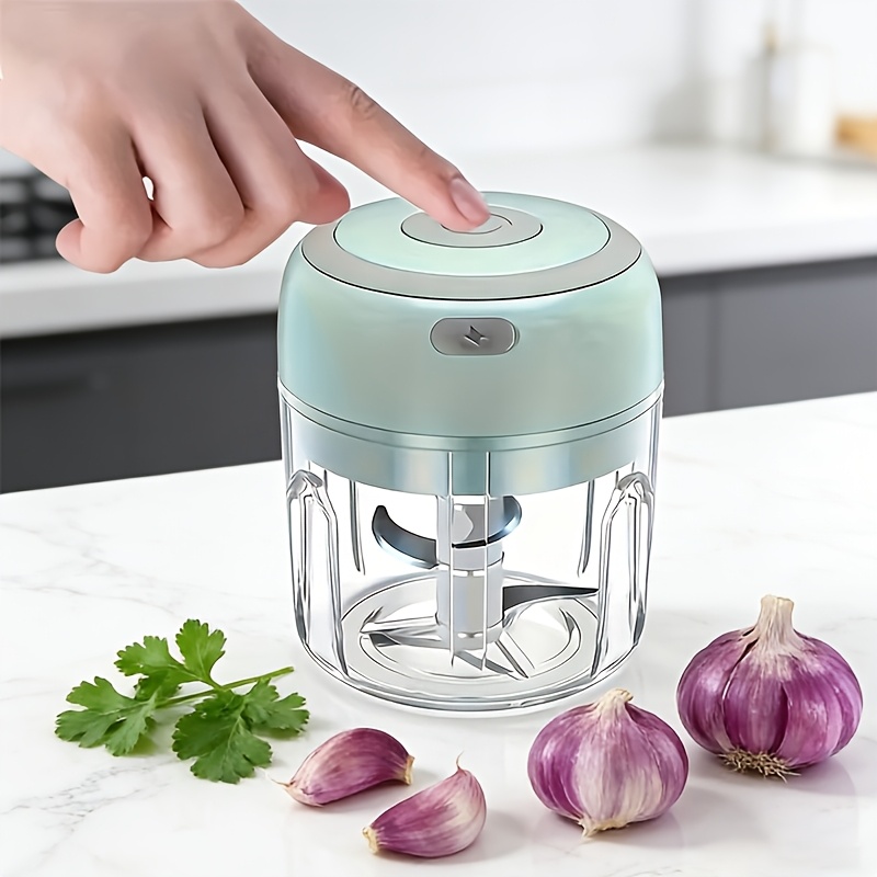 This electric mini food chopper is designed for chopping and mincing small portions of ingredients. The compact form factor supports quick prep for items like garlic, onion, herbs, and ginger. An enclosed chopping cup helps keep ingredients contained during operation. The portable design is intended for convenient handling and storage between uses.