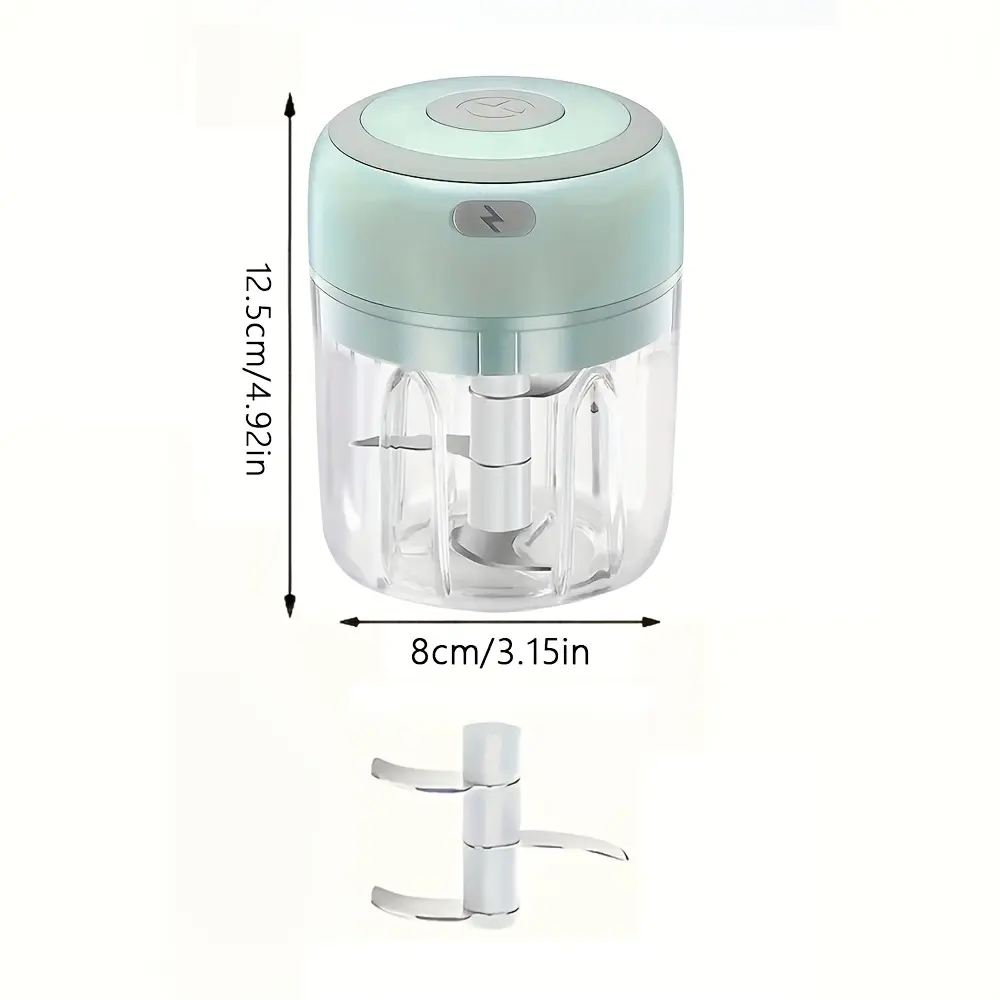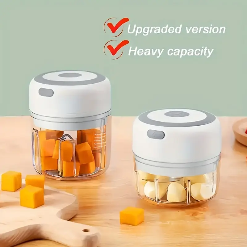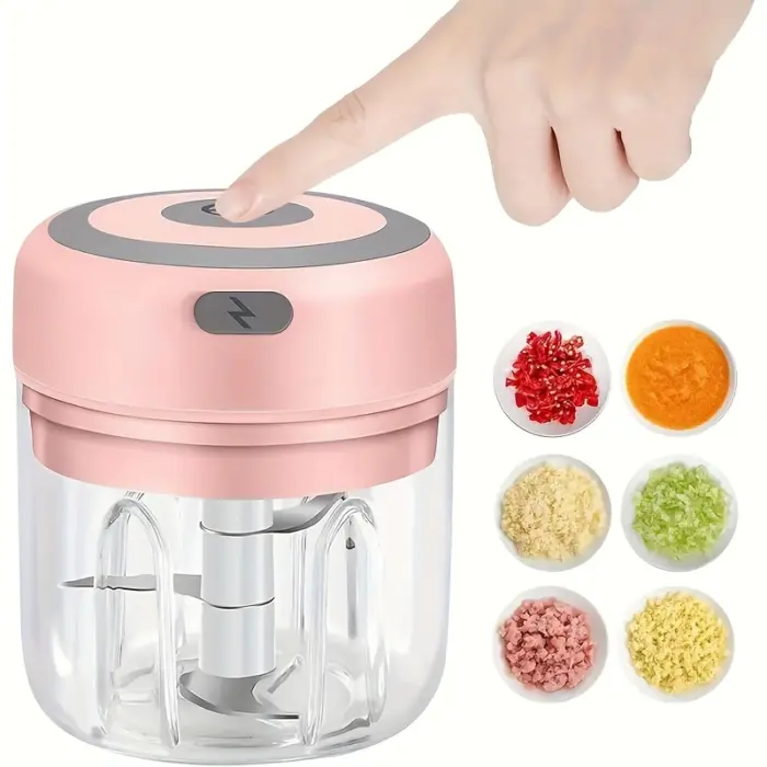 This electric mini food chopper is designed for chopping and mincing small portions of ingredients. The compact form factor supports quick prep for items like garlic, onion, herbs, and ginger. An enclosed chopping cup helps keep ingredients contained during operation. The portable design is intended for convenient handling and storage between uses.