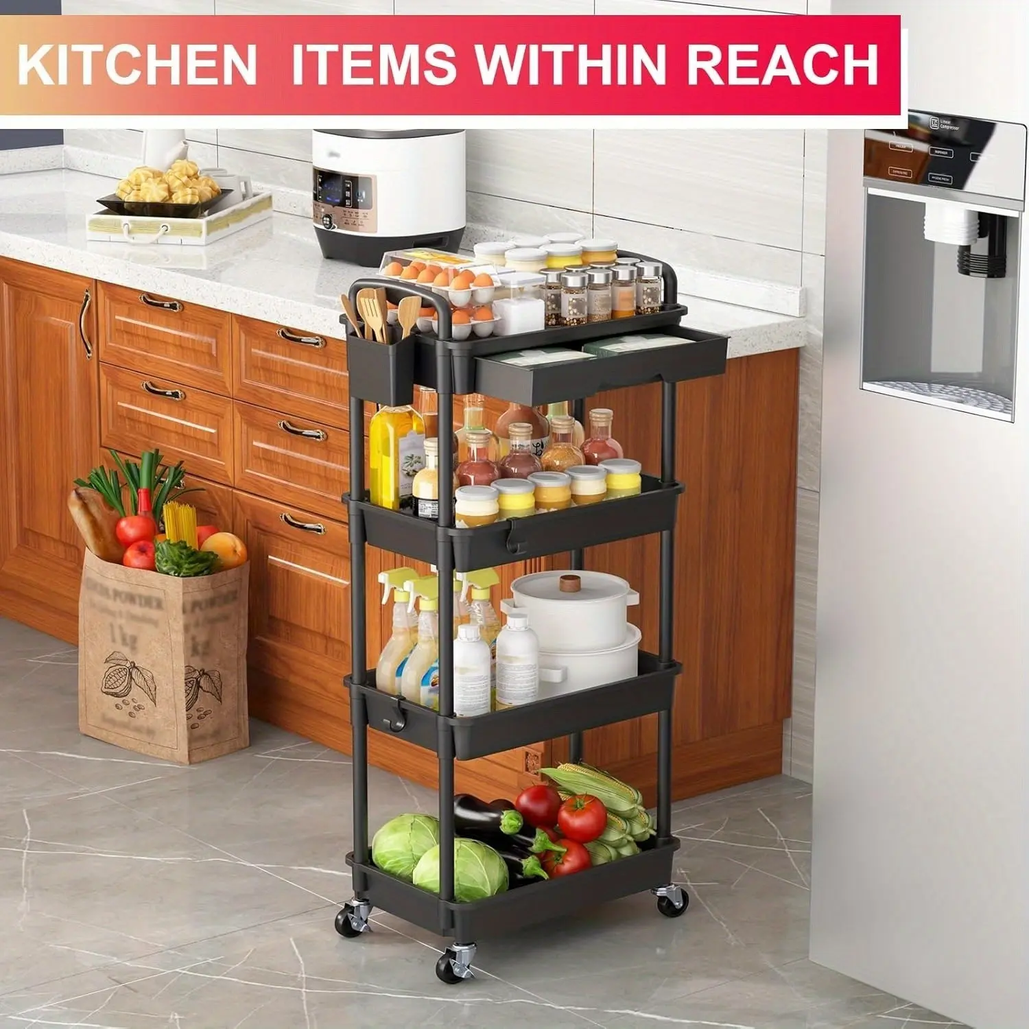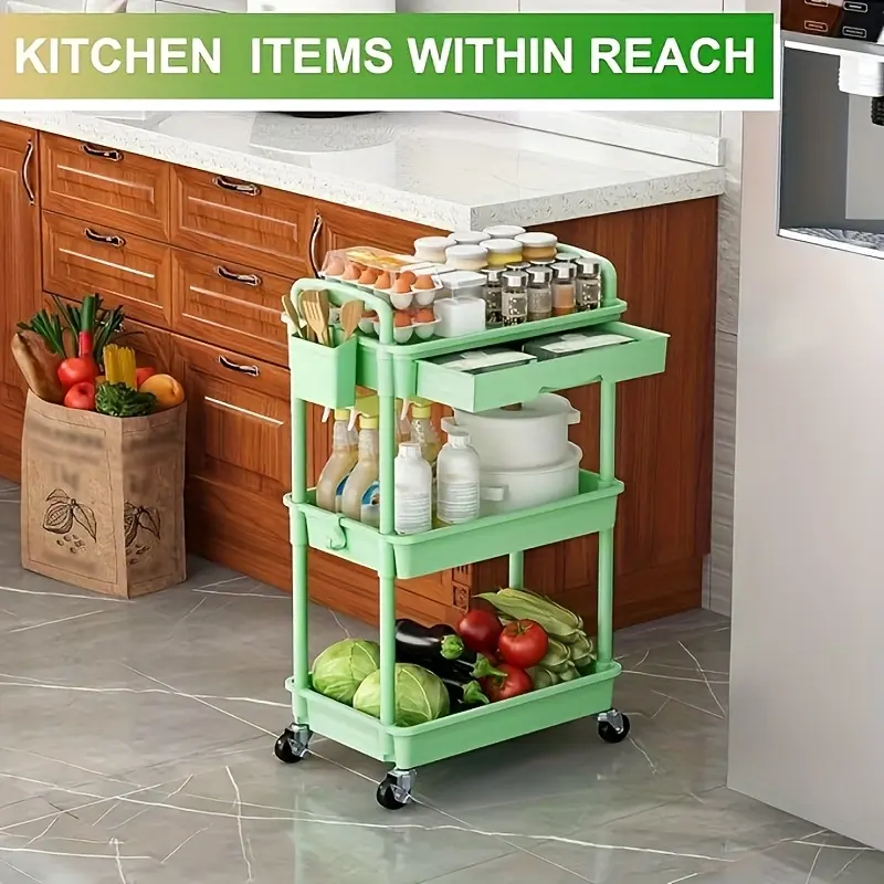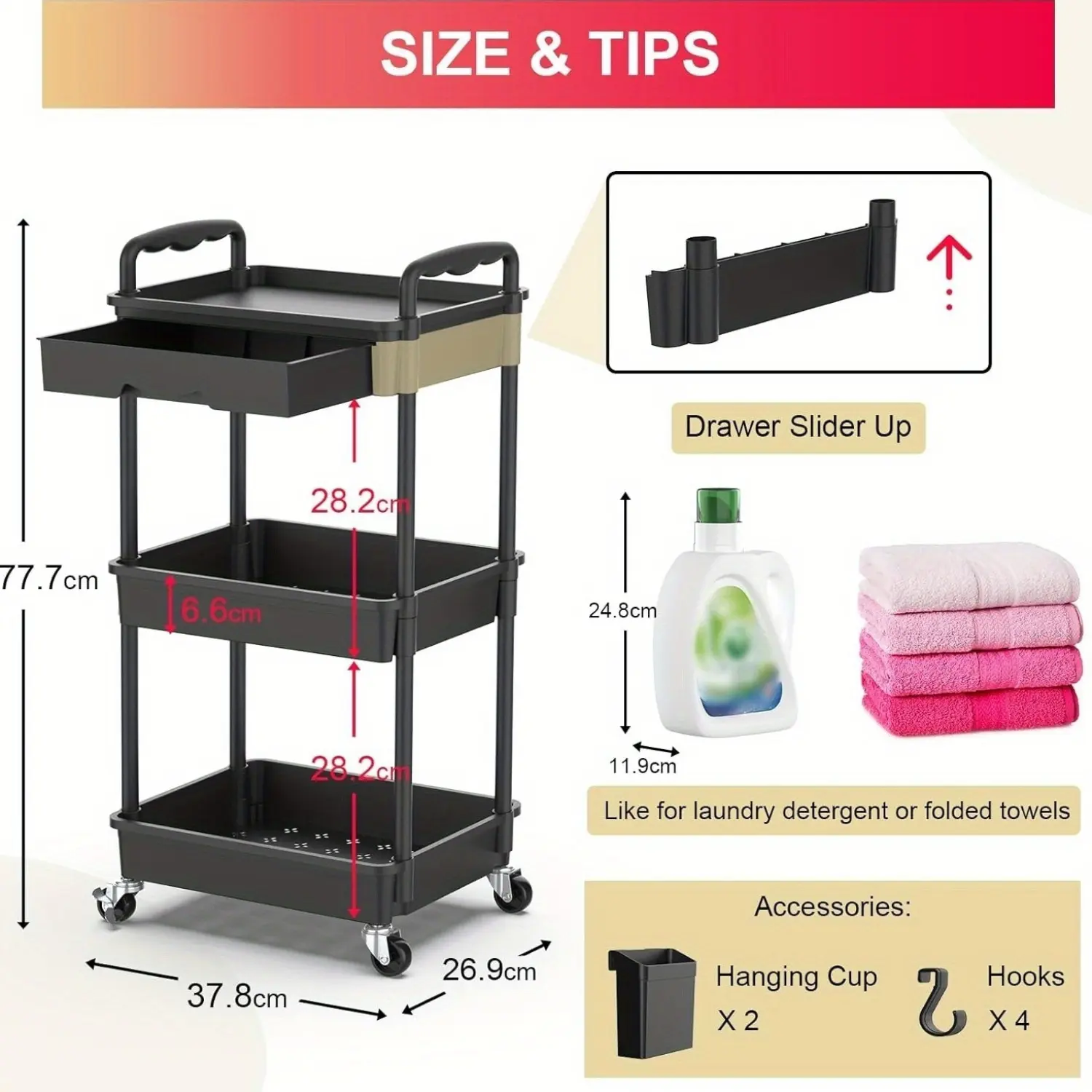 This rolling storage cart is designed for organizing and transporting household supplies in a compact footprint. The multi-tier layout provides separated levels for sorting items, while integrated drawers help keep smaller items contained. Lockable wheels support controlled movement and stable positioning when parked. The plastic construction is intended for routine indoor use and wipe-clean maintenance.