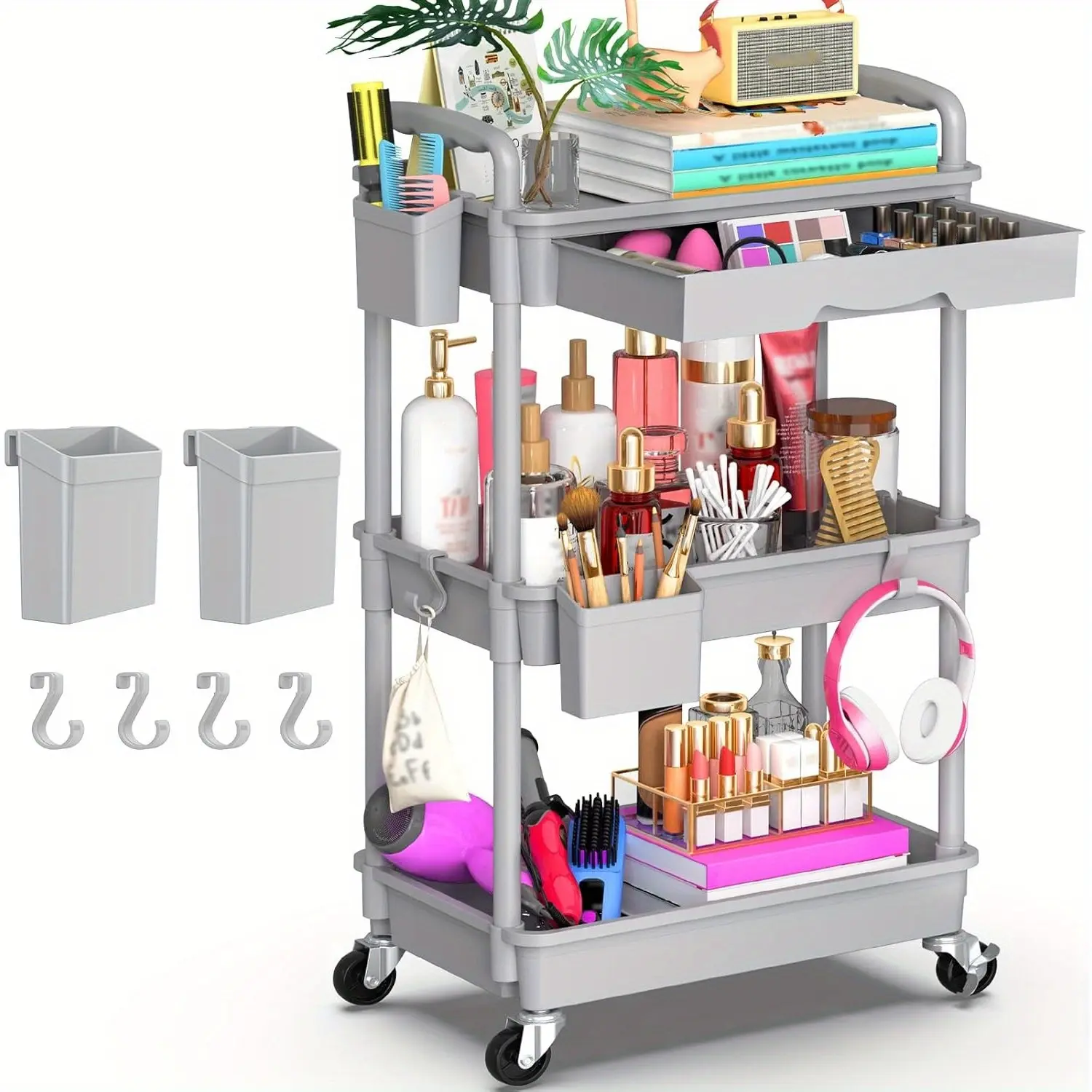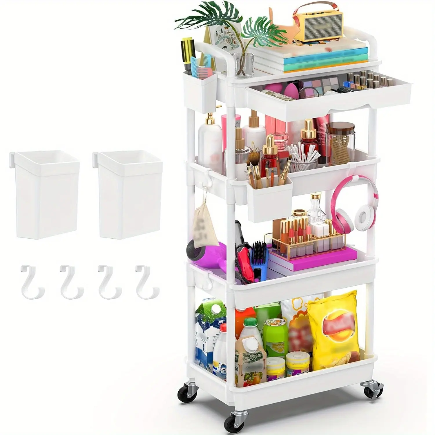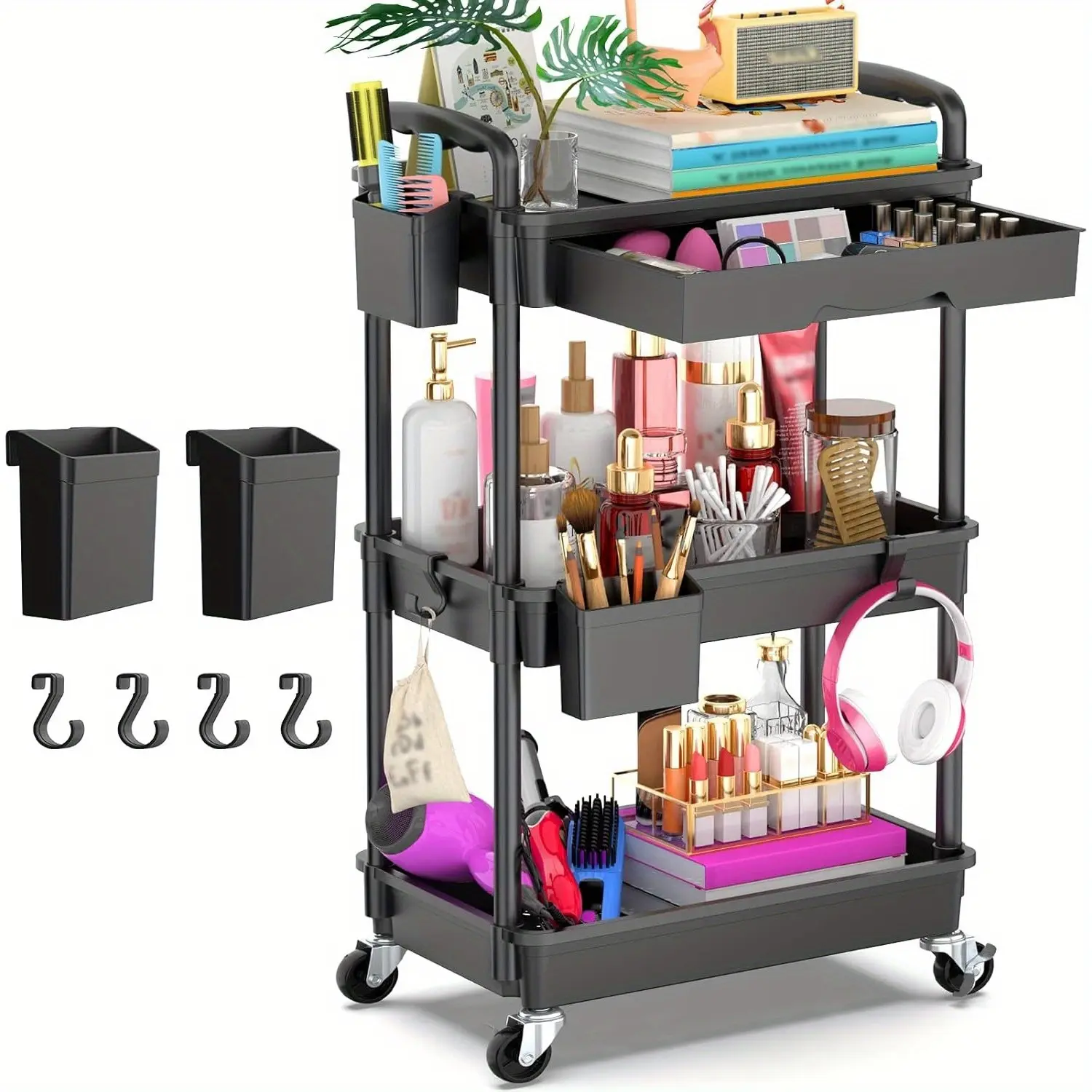 This rolling storage cart is designed for organizing and transporting household supplies in a compact footprint. The multi-tier layout provides separated levels for sorting items, while integrated drawers help keep smaller items contained. Lockable wheels support controlled movement and stable positioning when parked. The plastic construction is intended for routine indoor use and wipe-clean maintenance.